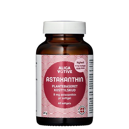 Astaxanthin fra Aliga Aqtive indeholder 8 mg per softgel kapsel. Astaxanthin fra Aliga Aqtive er udvundet direkte fra mikroalgen Haematococcus pluvialis, som lever i det kolde nordatlantiske hav omkring Island.