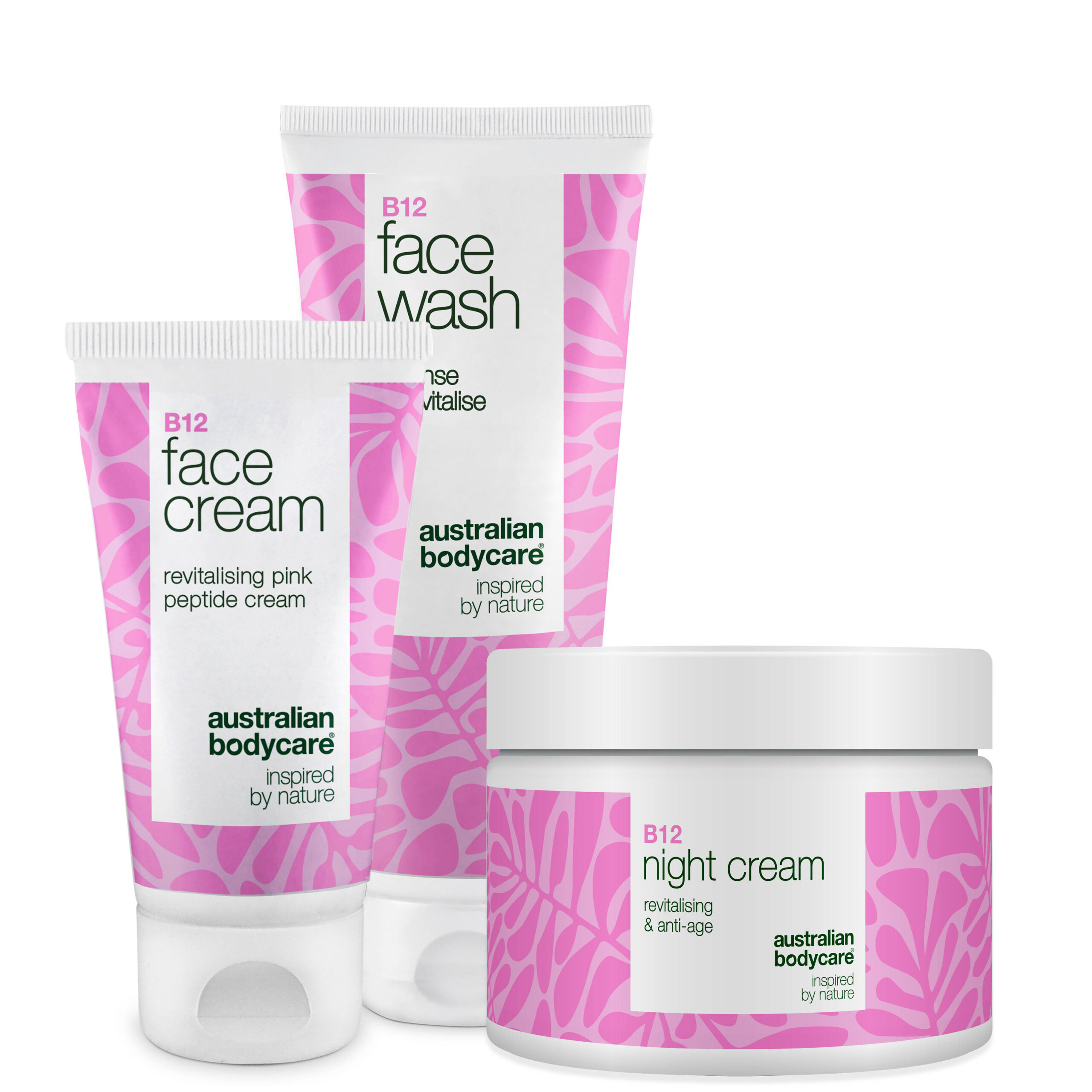 Få bugt med rødme og tør hud – Sæt med B12 Face Wash, Face Cream og Night Cream Oplever du rødme i ansigtet, ujævn hudtone eller tør hud omkring øjnene? Det kan være både frustrerende og svært at finde den rette løsning. Australian Bodycare har skabt en