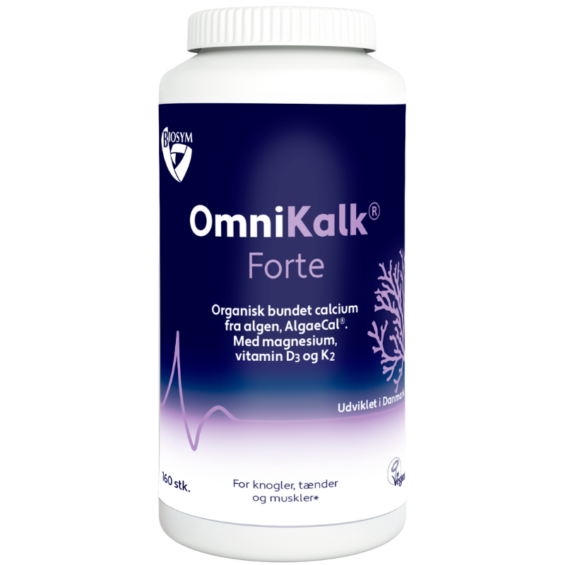 OmniKalk Forte kombinerer vegansk calcium, magnesium, D3 og K2 for stærke knogler, tænder og muskler – registreret ved The Vegan Society.