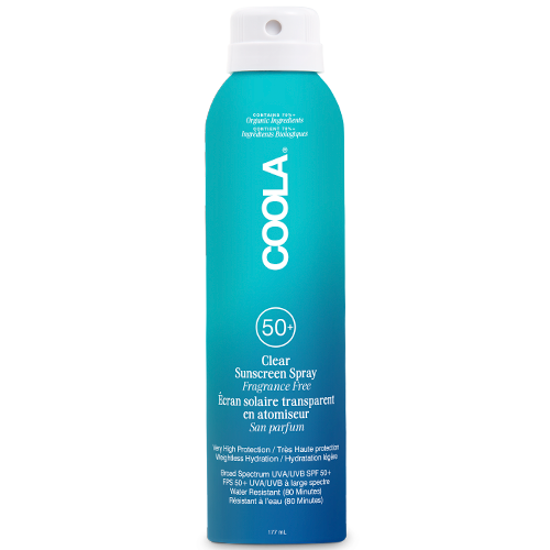 Klar SPF 50 solcreme spray uden nogen form for duft, der ikke kan ses på huden.