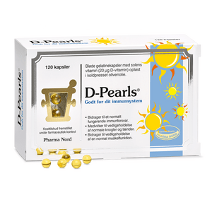 Pharma Nord D-Pearls 20 µg – synkevenlig og naturlig, stærk D-vitamin D-Pearls fra Pharma Nord består af små, bløde gelatinekapsler med 20 μg D3-vitamin i hver kapsel. D-vitaminet er opløst i koldpresset olivenolie for at forbedre optagelsen. Kapslerne