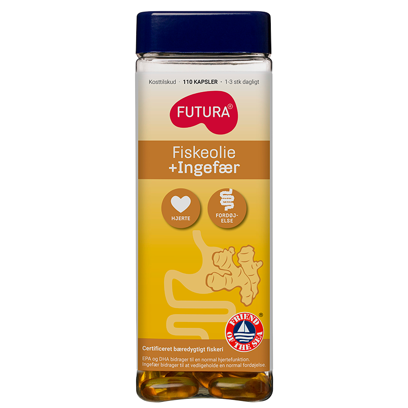 Fiskeolie/Ingefær fra Futura inderholder DHA og EPA, som bidrager til en normal hjerte- og hjernefunktion. Kosttilskuddet indeholder også ingefærekstrakt, der bidrager til en normal fordøjelse.