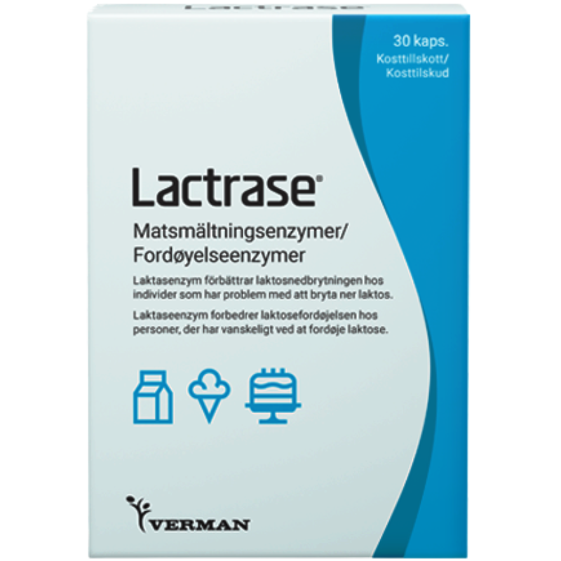 Lactrase® indeholder laktaseenzym, som forbedrer lactosefordøjelsen hos personer, der har vanskeligt ved at fordøje lactose.