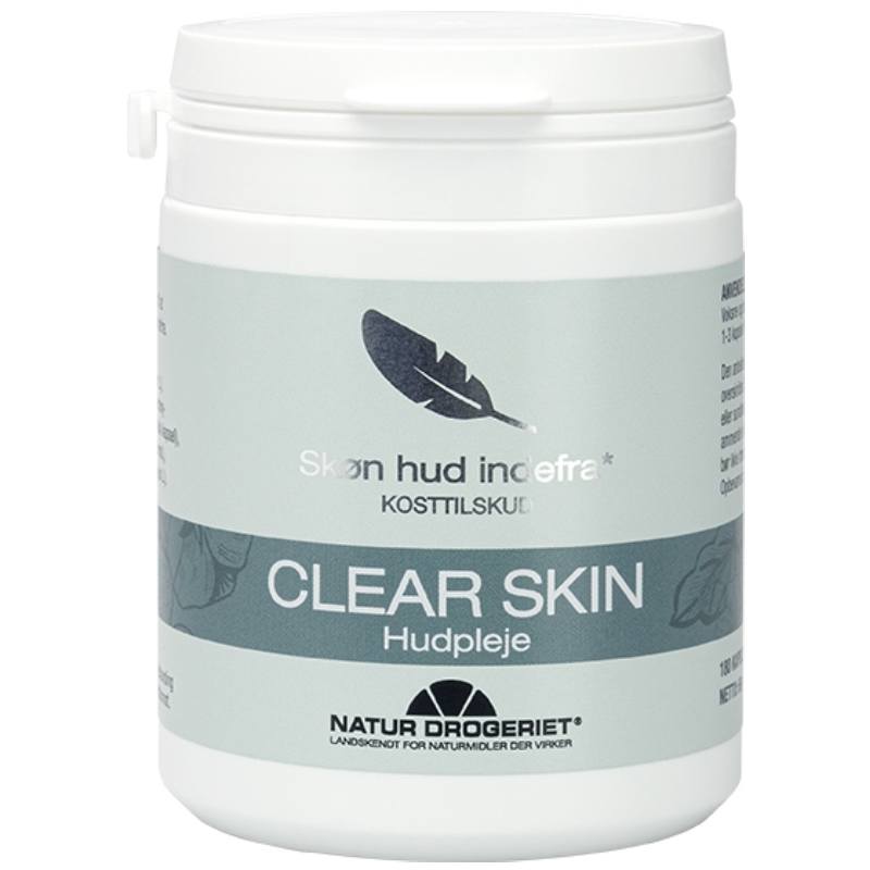 Natur Drogeriet Clear Skin er et vegansk kosttilskud til voksne og børn fra 11 år. Clear Skin kapsler indeholder fire droger: Stedmoderblomst, burrerod, sarsaparillerod og blomsterkarse – en smagskombination, der kan være svær at holde af. Derfor fås de