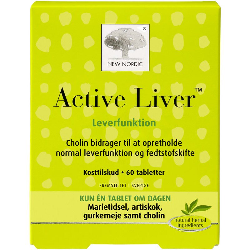 New Nordic Active Liver er et kosttilskud der indeholder en kombination af urteekstrakter. Disse består blandt andet af marietidsel, artiskok og gurkemeje, samt det vitaminlignende stof cholin. Artiskok og marietidsel støtter lever-funktionen og indeholde