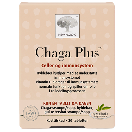 Chaga Plus⢠er en tablet baseret på ekstrakt fra chaga svampe, kombineret med ekstrakt af hyldebær, gul østershat sampe og lang peber samt vitaminerne B6, B12, folsyre, vitamin D og mineralerne zink, kobber og selen.