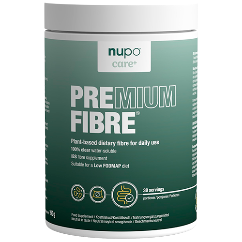 Nupo Care+ Premium Fibre – 100% klare, vandopløselige kostfibre, udvundet af guarbønner. Et nemt og bekvemt supplement til at øge det daglige fiberindtag.