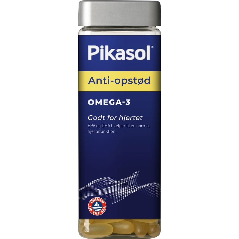 Pikasol® Anti·opstød er et kosttilskud. Den unikke coatning af kapslerne sikrer, at de først opløses i tarmen og ikke i mavesækken som almindelige kapsler. Dette sikrer 100% ingen fiskeopstød. EPA og DHA hjælper til en normal hjertefunktion. Den gavnlig