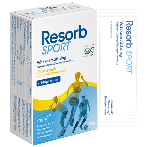 Kulhydrat- og elektrolytopløsning til sport RESORB Sport (10 stk) er et kosttilskud i form af et vandopløseligt pulver, der kan anvendes som væskeerstatning til sportsudøvere. Pulveret er formuleret med en kombination af kalcium og magnesium, som blandt a