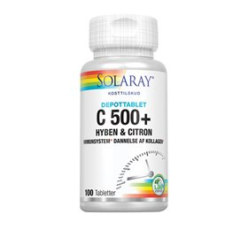 C 500+ depottablet. Et C-vitaminprodukt indeholdende 500 mg ascorbinsyre, sammen med 50 mg hybenfrugt og 25 mg citronfrugtekstrakt i hver tablet.Â