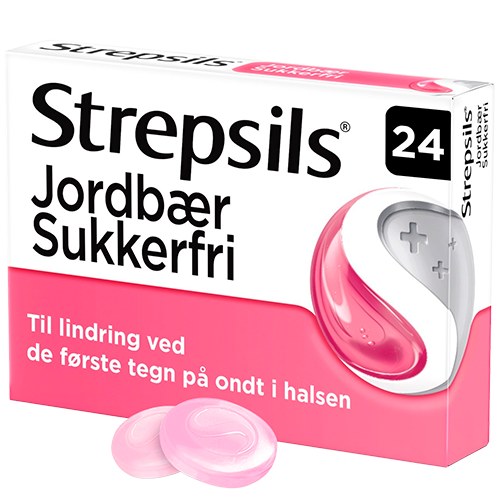 Strepsils forebygger og behandler ondt i halsen. En sukkerfri variant med en smag af jordbær.