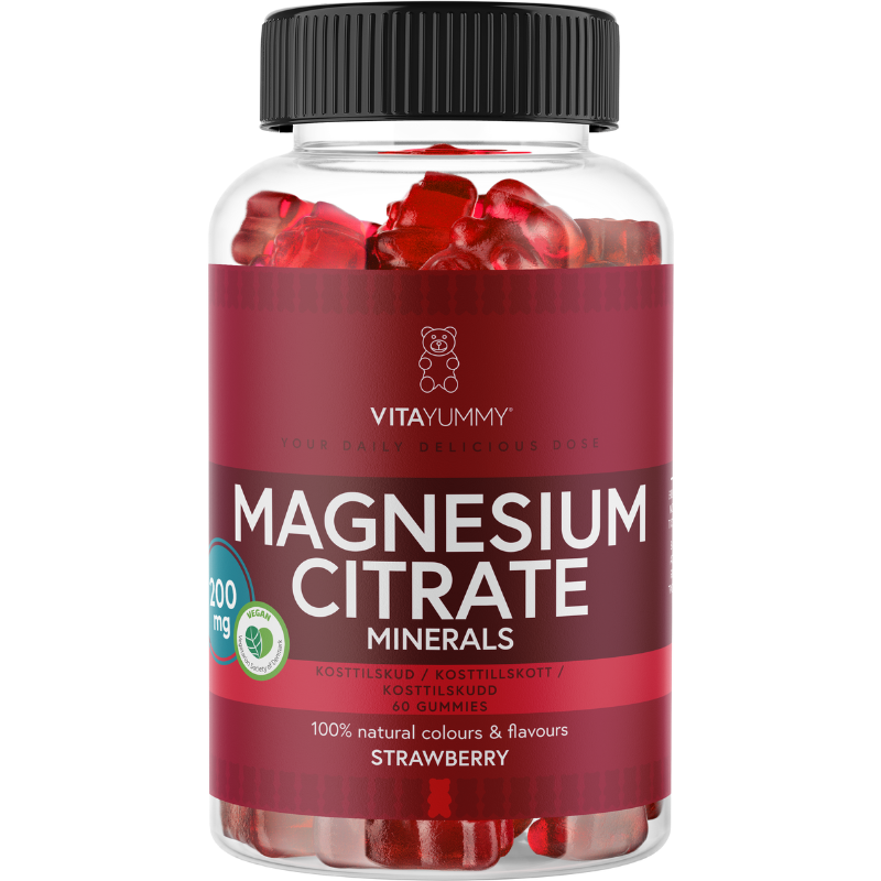 VitaYummy Magnesium Citrate indeholder 200 mg magnesium citrat og har en lækker jordbær smag.